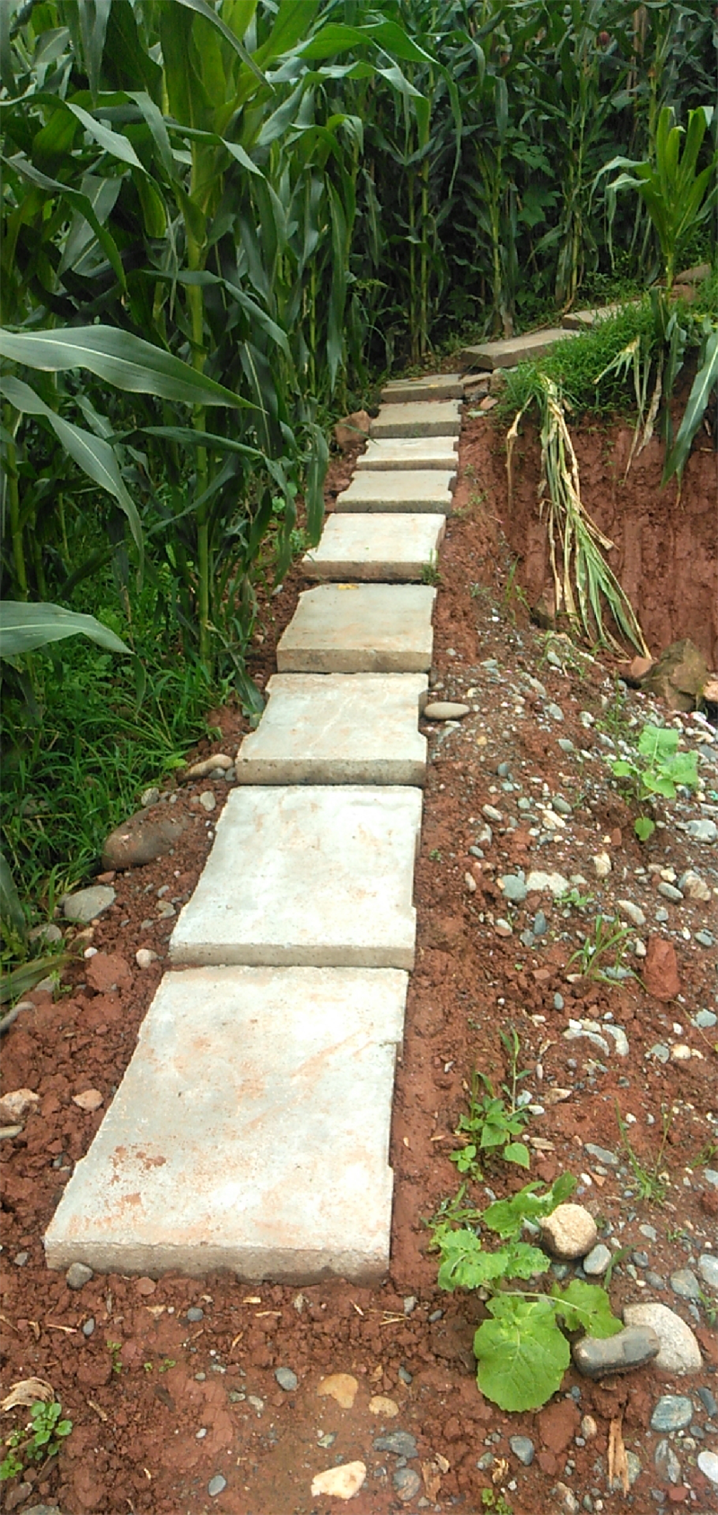 在蘆山縣佛圖山項(xiàng)目建設(shè)中,路橋公司蘆山寶興片區(qū)臨時(shí)黨支部了解到此處有一段便道坑洼不平,遇到雨季道路泥濘,嚴(yán)重影響村民的生活和生產(chǎn),且存在一定的安全隱患。為此,臨時(shí)黨支部主動(dòng)提出要為群眾修補(bǔ)便道,原本只是一個(gè)帶斜角的陡坡,通過加蓋水泥預(yù)制板臺(tái)階,便道變得平整起來(lái)?紤]到出行的方便性,還將便道與通村馬路連接在一起,受到當(dāng)?shù)匕傩盏母叨荣潛P(yáng),群眾出行難題得到有效解決。