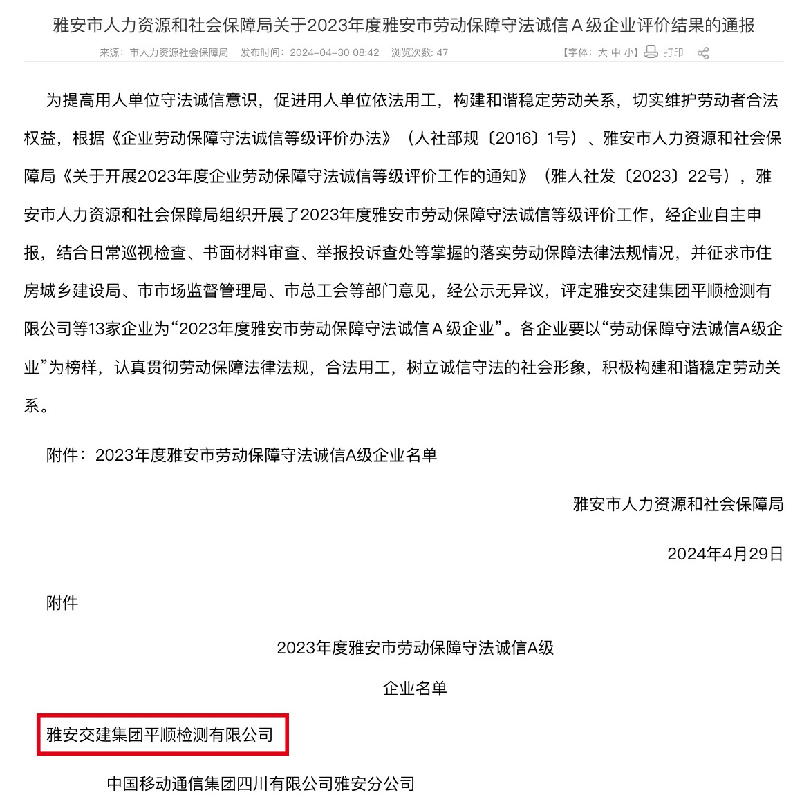 近日,雅安市人社局發(fā)布通報(bào),雅安交建集團(tuán)平順公司被評定為“2023年度雅安市勞動(dòng)保障守法誠信A級企業(yè)”。此次評選由人社局結(jié)合日常巡視檢查、書面材料審查、舉報(bào)投訴查處以及專項(xiàng)檢查等活動(dòng)掌握的落實(shí)勞動(dòng)保障法律法規(guī)情況,并征求市場監(jiān)管局等部門和單位意見后,綜合評定而出。