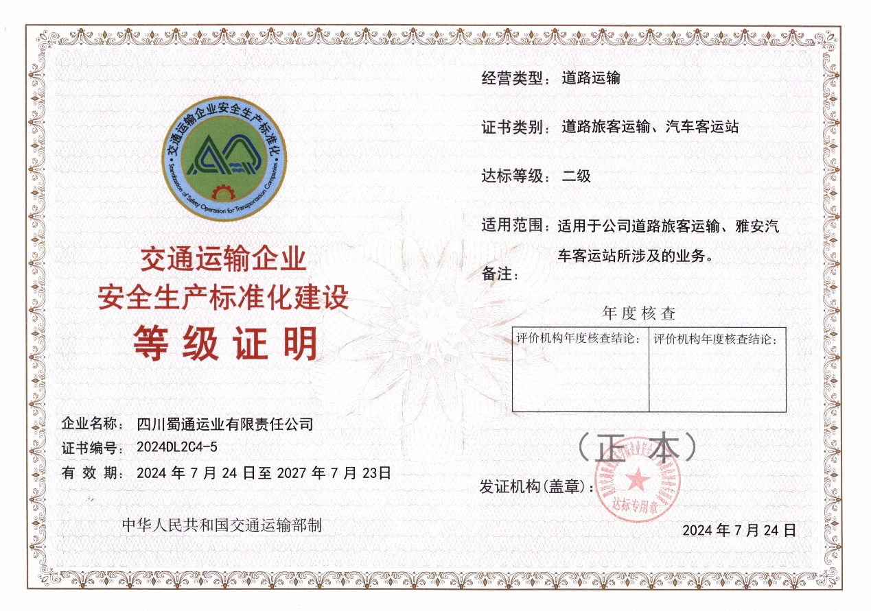近日,經(jīng)四川省交通運輸企業(yè)安全生產(chǎn)標準化評價機構(gòu)綜合評定,雅安交建集團蜀通公司順利通過安全標準化二級企業(yè)驗收并獲得等級證書,標志著公司安全管理工作更趨于標準化,安全管理水平邁上了新臺階。