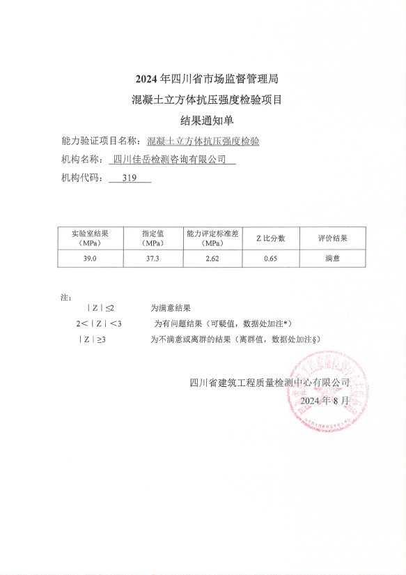 喜訊!四川佳岳檢測咨詢有限公司(簡稱:佳岳公司)在2024年度四川省市場監(jiān)督管理局組織的檢驗(yàn)檢測機(jī)構(gòu)能力驗(yàn)證項(xiàng)目中,參與的“混凝土立方體抗壓強(qiáng)度檢驗(yàn)”項(xiàng)目獲得“滿意”評價(jià)。