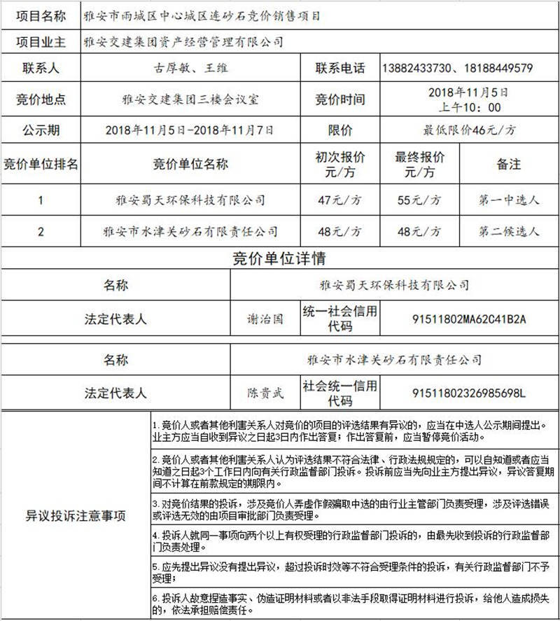 雅安交建集團(tuán)資產(chǎn)經(jīng)營管理有限公司關(guān)于雅安市雨城區(qū)中心城區(qū)連砂石競價(jià)銷售結(jié)果公示