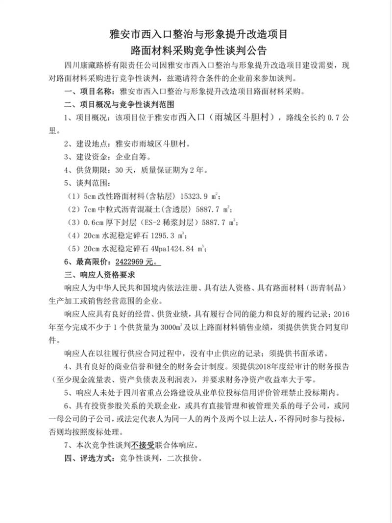 雅安市西入口整治與形象提升改造項(xiàng)目路面材料采購(gòu)競(jìng)爭(zhēng)性談判公告