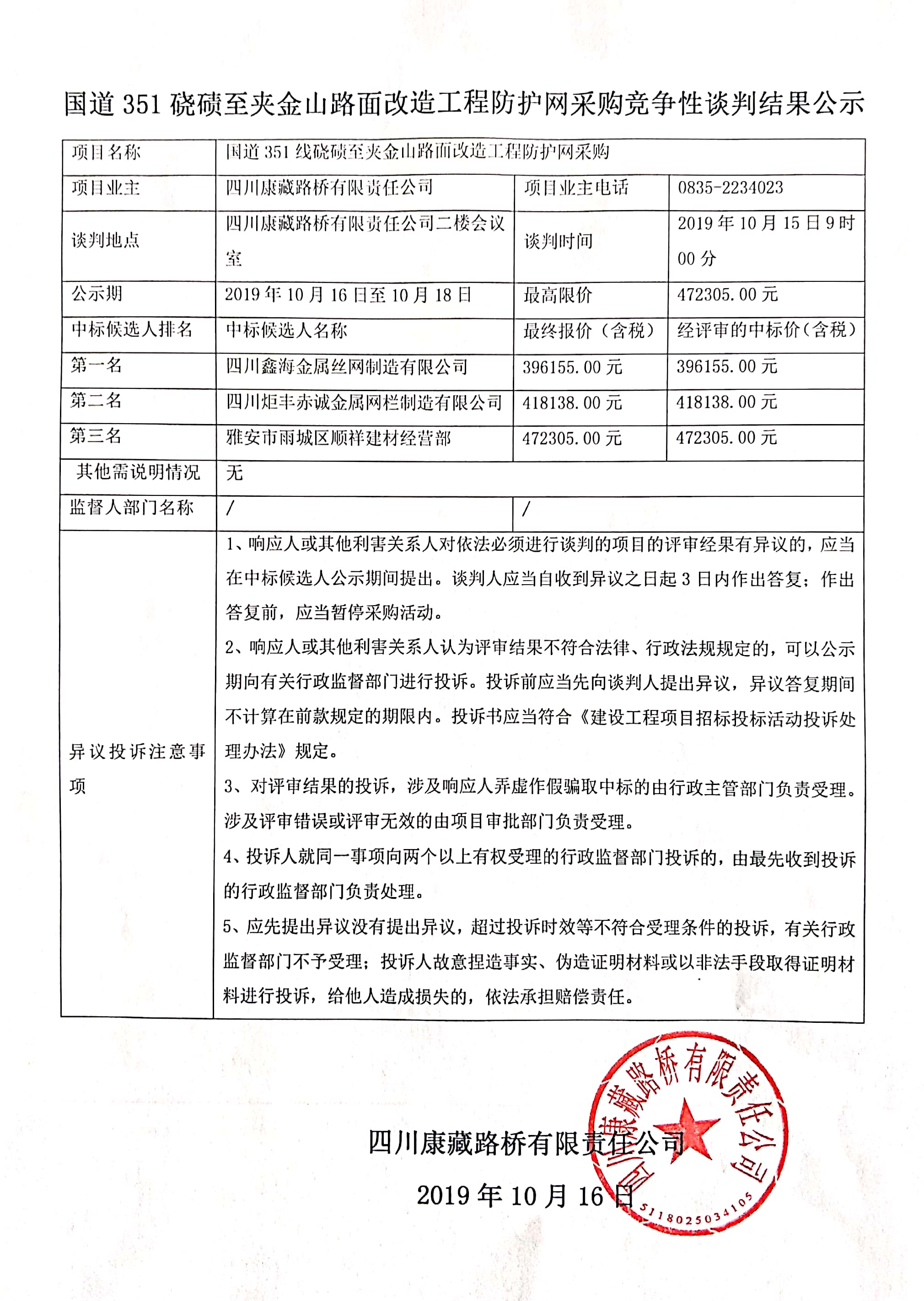 四川康藏路橋有限責(zé)任公司國道351磽磧至夾金山路面改造工程防護(hù)網(wǎng)采購競(jìng)爭(zhēng)性談判結(jié)果公示
