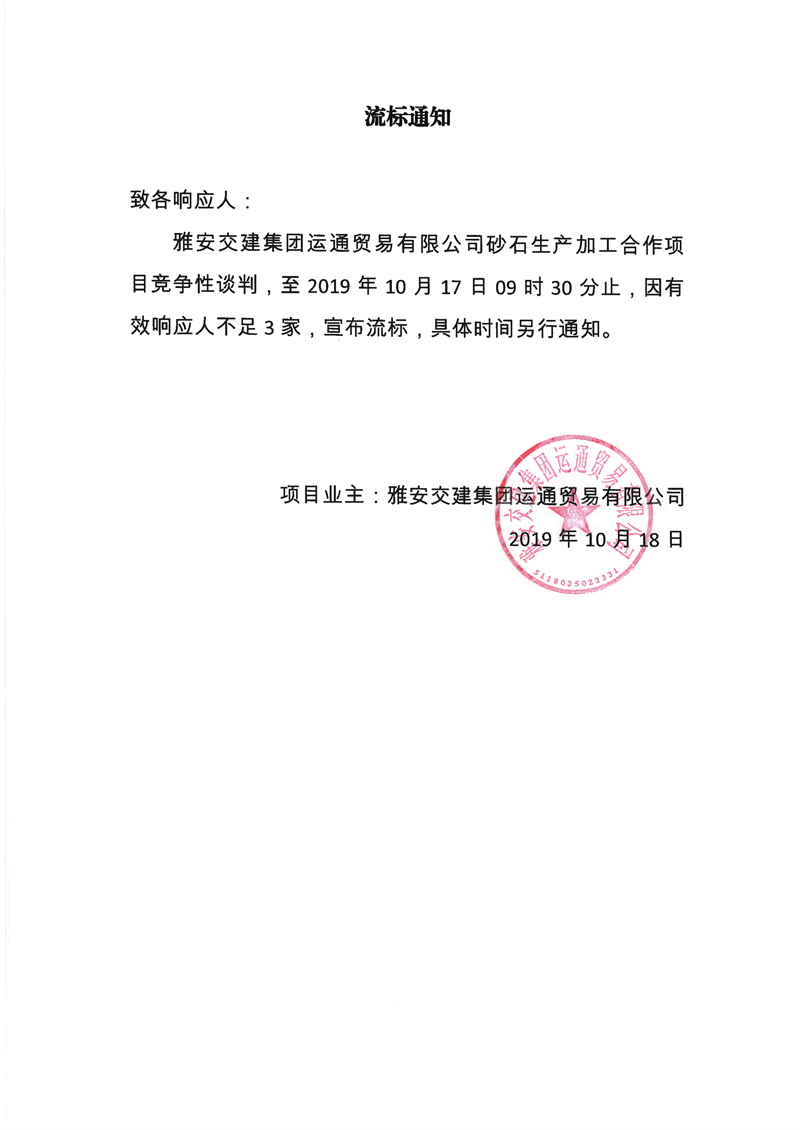 雅安交建集團運通貿易有限公司砂石生產加工合作項目流標通知