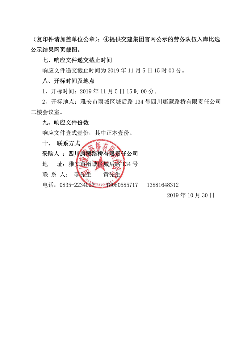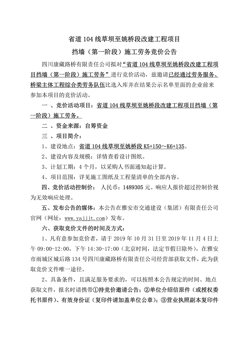 四川康藏路橋有限責任公司省道104線草壩至姚橋段改建工程項目擋墻(第一階段)施工勞務競價公告