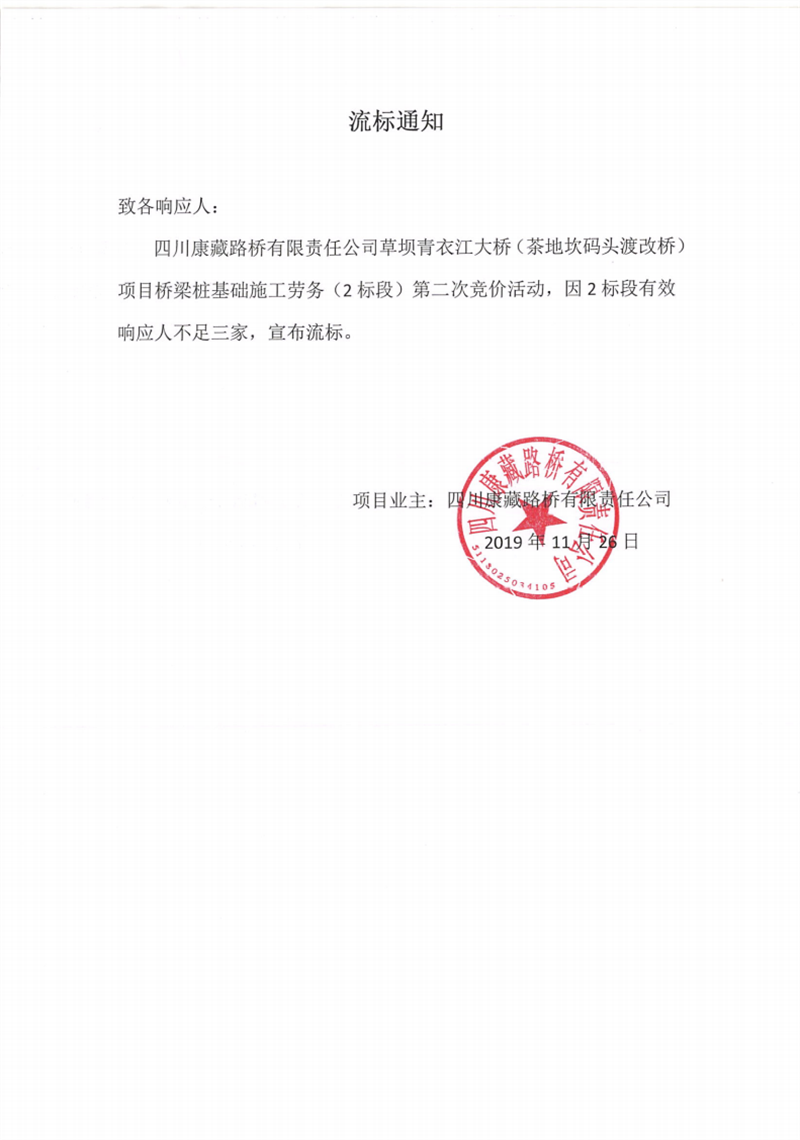 四川康藏路橋有限責(zé)任公司草壩青衣江大橋(茶地坎碼頭渡改橋)項目橋梁樁基礎(chǔ)(2標段)施工勞務(wù)競價(第二次)流標通知