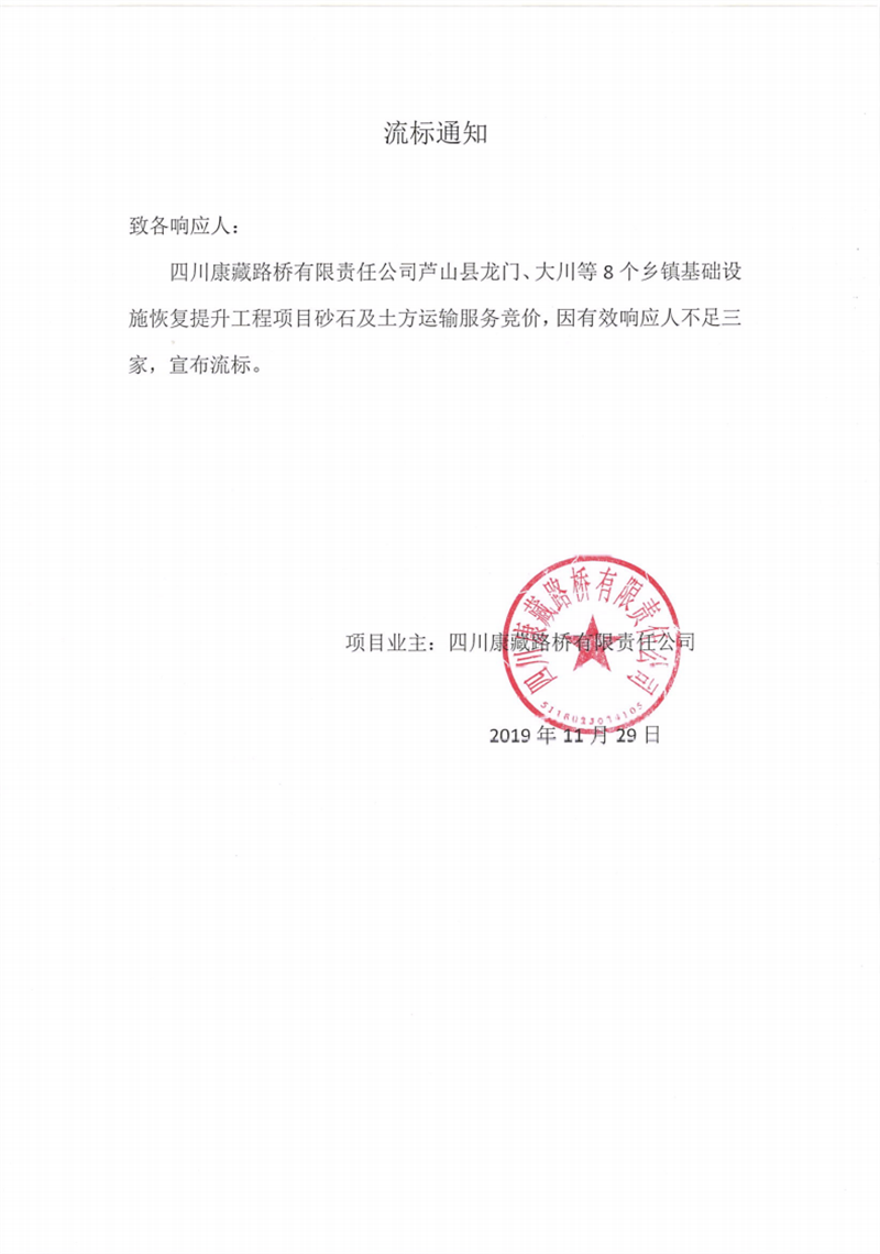 四川康藏路橋有限責(zé)任公司蘆山縣龍門、大川等8個(gè)鄉(xiāng)鎮(zhèn)基礎(chǔ)設(shè)施恢復(fù)提升工程項(xiàng)目砂石及土方運(yùn)輸服務(wù)競價(jià)流標(biāo)通知