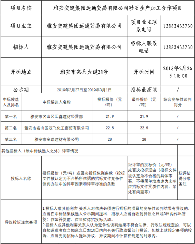 雅安交建集團運通貿(mào)易有限公司砂石生產(chǎn)加工合作項目競爭性談判結果公示