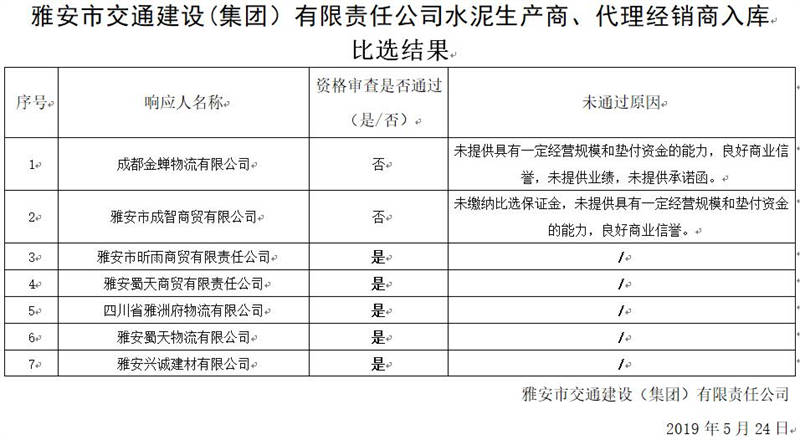 雅安市交通建設(shè)(集團(tuán))有限責(zé)任公司水泥生產(chǎn)商、代理經(jīng)銷商入庫比選結(jié)果公示