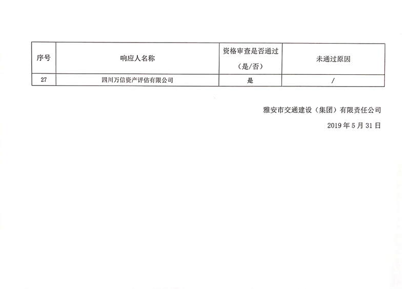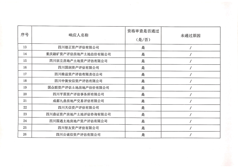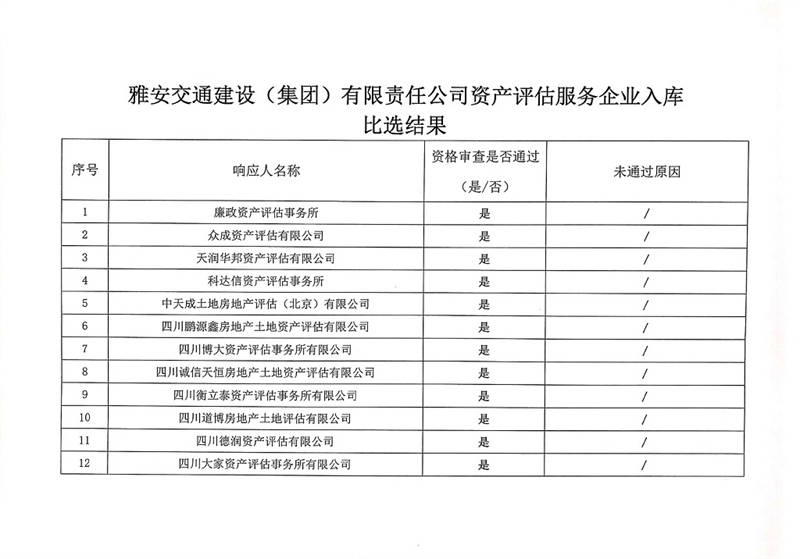 雅安交通建設(集團)有限責任公司資產評估服務企業(yè)入庫比選結果