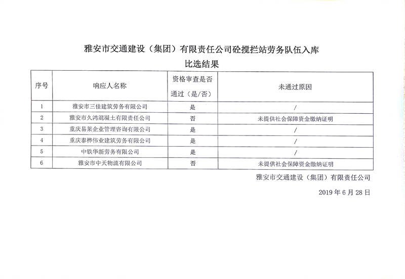 雅安市交通建設(集團)有限責任公司砼攪攔站勞務隊伍入庫比選結(jié)果