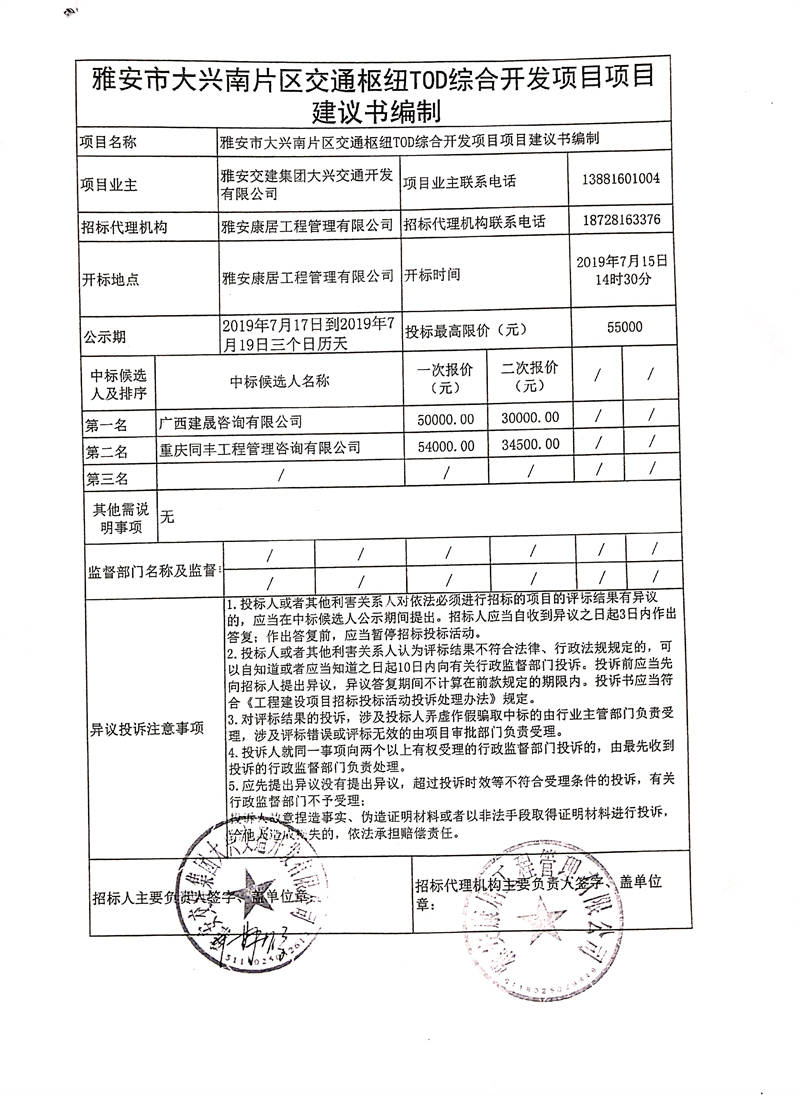 雅安交建集團大興交通開發(fā)有限公司雅安市大興南片區(qū)交通樞紐TOD綜合開發(fā)項目項目建議書編制競爭性談判結果公示