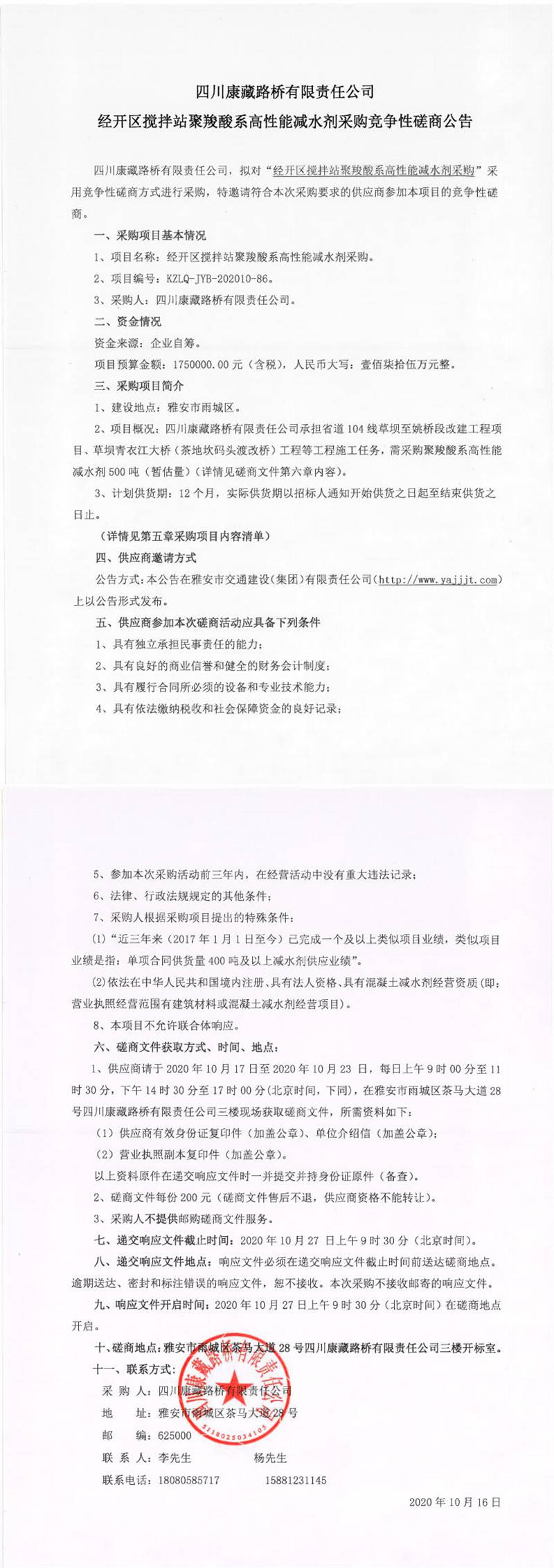 四川康藏路橋有限責(zé)任公司經(jīng)開區(qū)攪拌站聚羧酸系高性能減水劑采購競(jìng)爭(zhēng)性磋商公告