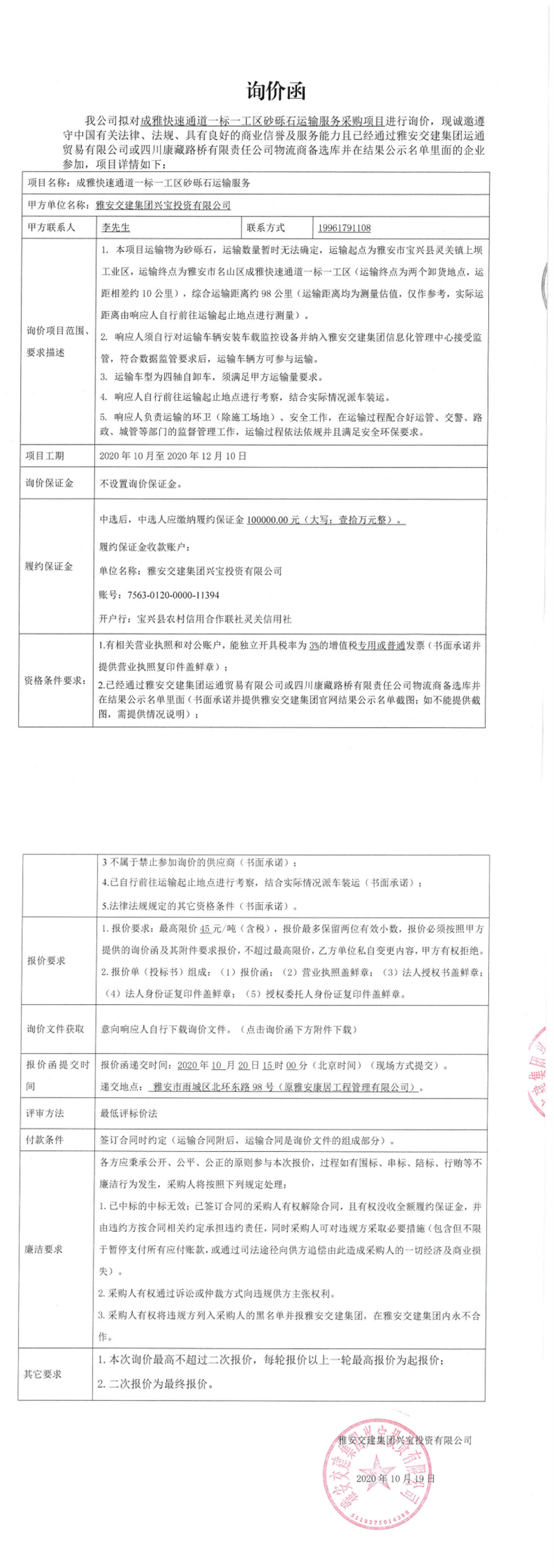 雅安交建集團興寶投資有限公司成雅快速通道一標一工區(qū)砂礫石運輸服務采購項目詢價函