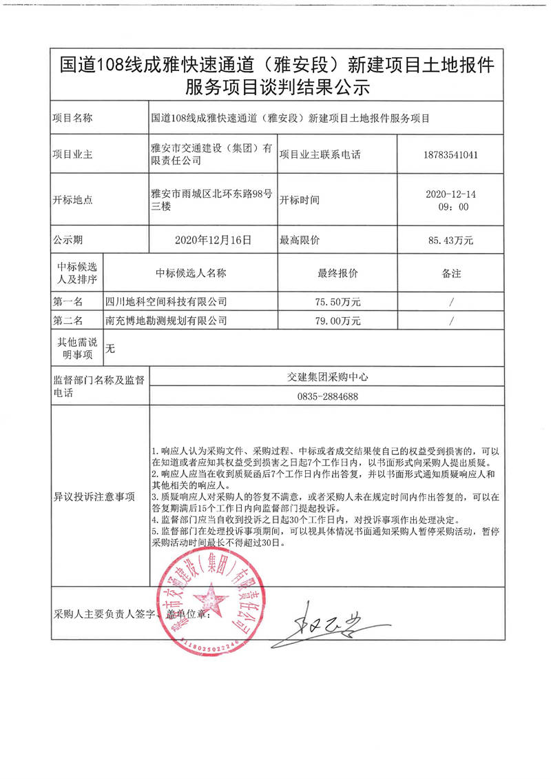 雅安市交通建設(集團)有限責任公司國道108線成雅快速通道(雅安段)新建項目土地報件服務項目談判結(jié)果公示