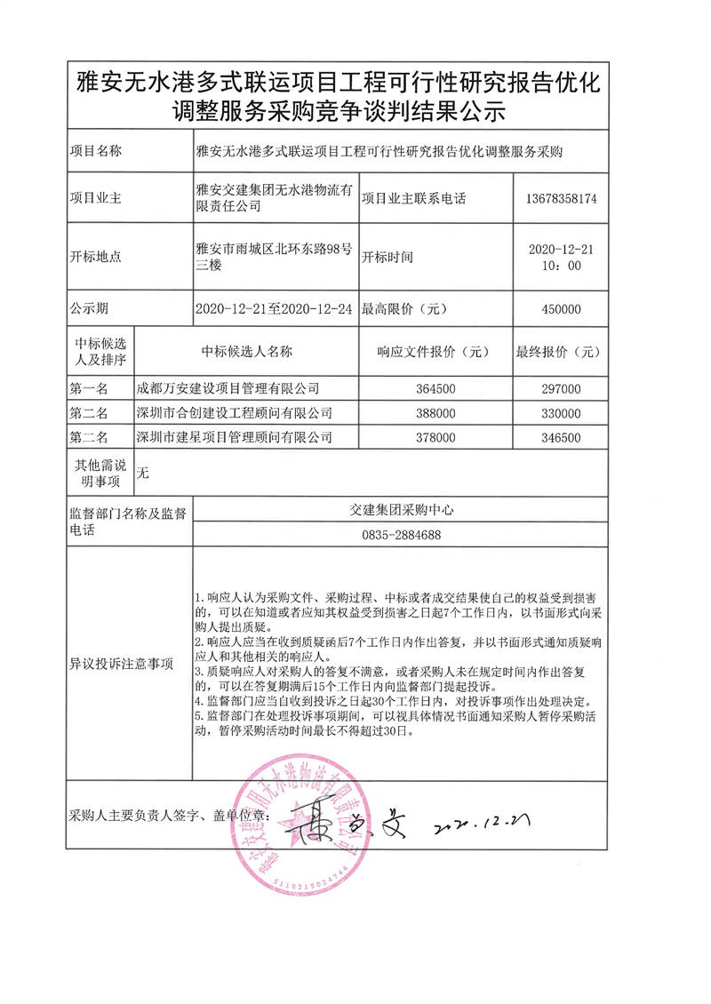 雅安交建集團無水港物流有限責任公司雅安無水港多式聯(lián)運項目工程可行性研究報告優(yōu)化調(diào)整服務(wù)采購競爭談判結(jié)果公示