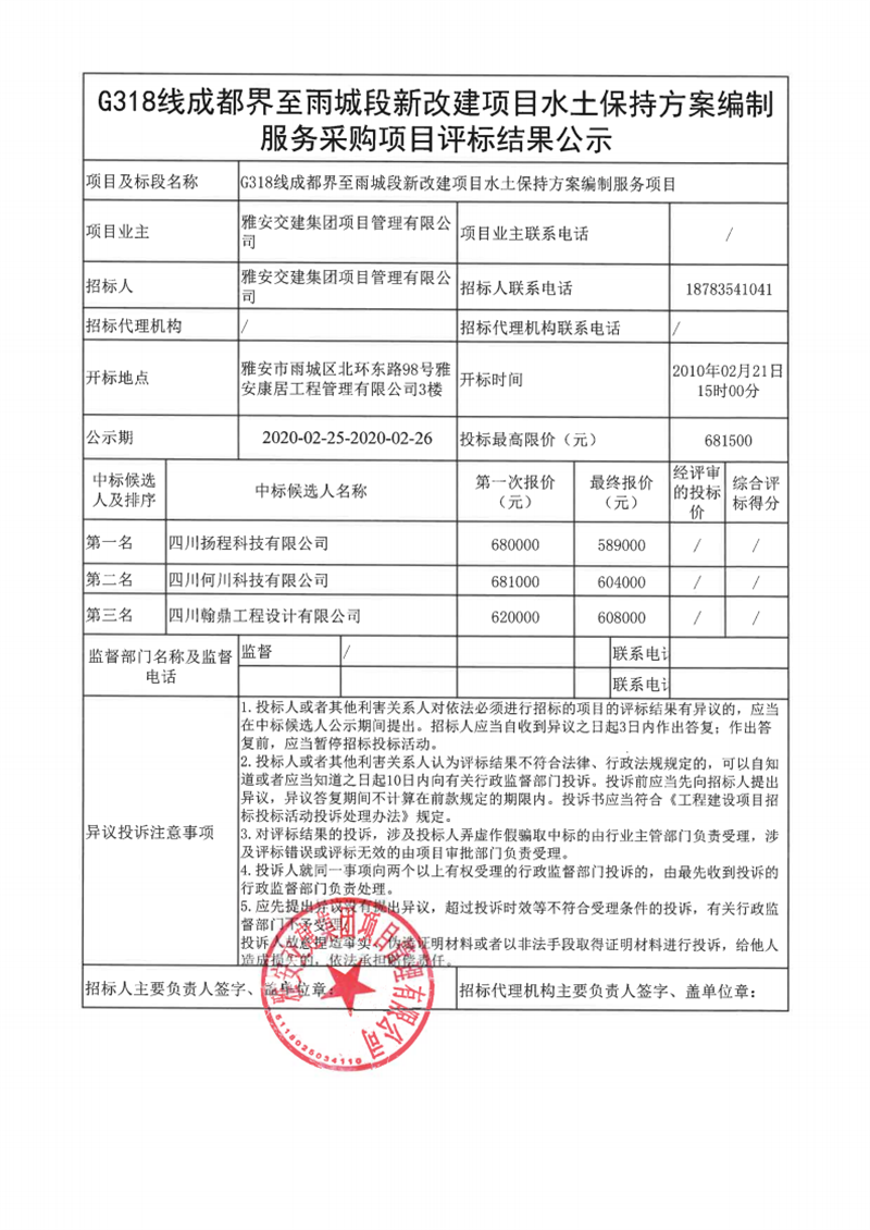 雅安交建集團項目管理有限公司G318線成都界至雨城段新改建項目水土保持方案編制服務(wù)采購項目評標結(jié)果公示
