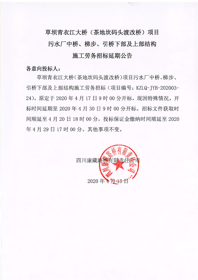 四川康藏路橋有限責(zé)任公司草壩青衣江大橋(茶地坎碼頭渡改橋)項目污水廠中橋、梯步、引橋下部及上部結(jié)構(gòu)施工勞務(wù)招標(biāo)延期公告