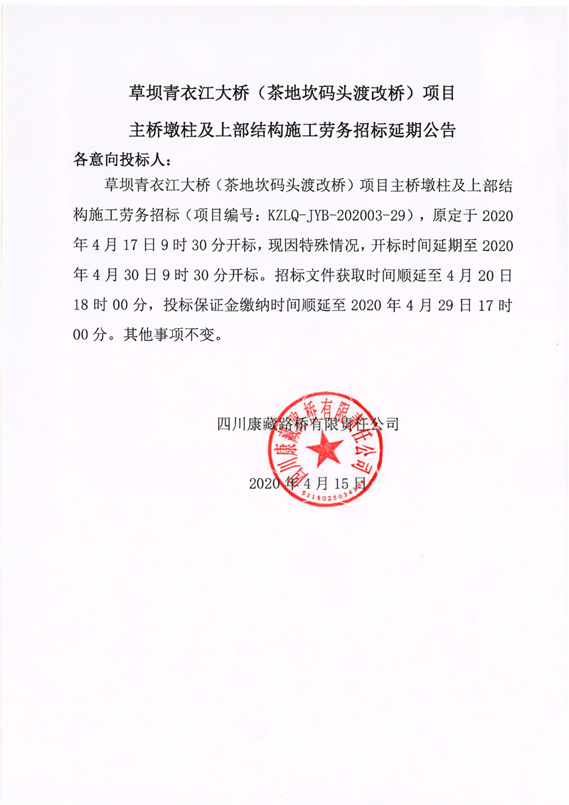 四川康藏路橋有限責(zé)任公司草壩青衣江大橋(茶地坎碼頭渡改橋)項目主橋墩柱及上部結(jié)構(gòu)施工勞務(wù)招標(biāo)延期公告