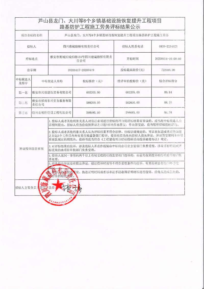 四川康藏路橋有限責任公司蘆山縣龍門、大川等8個鄉(xiāng)鎮(zhèn)基礎設施恢復提升工程項目路基防護工程施工勞務評標結果公示