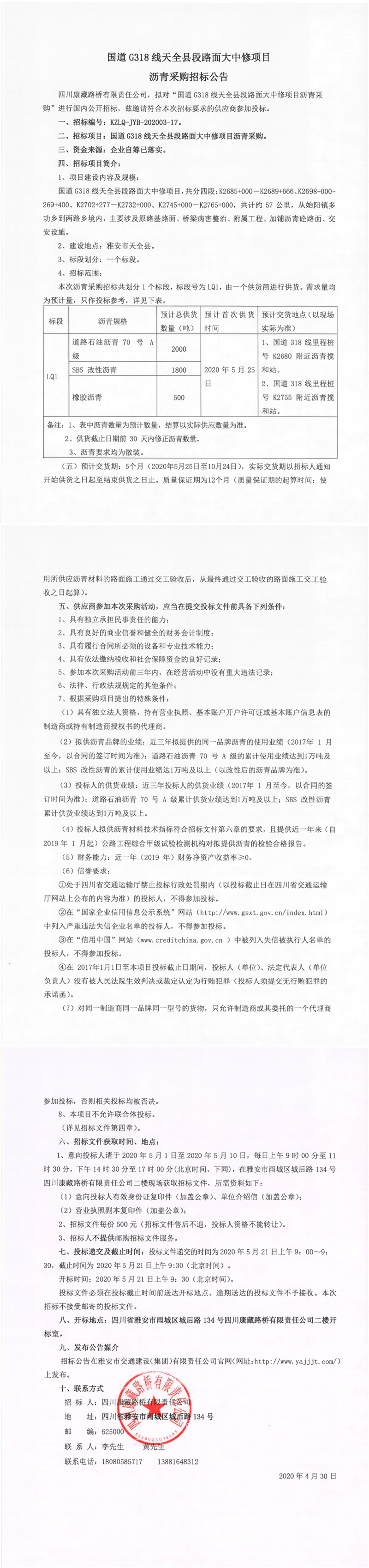 四川康藏路橋有限責(zé)任公司國道G318線天全縣段路面大中修項目瀝青采購招標(biāo)公告