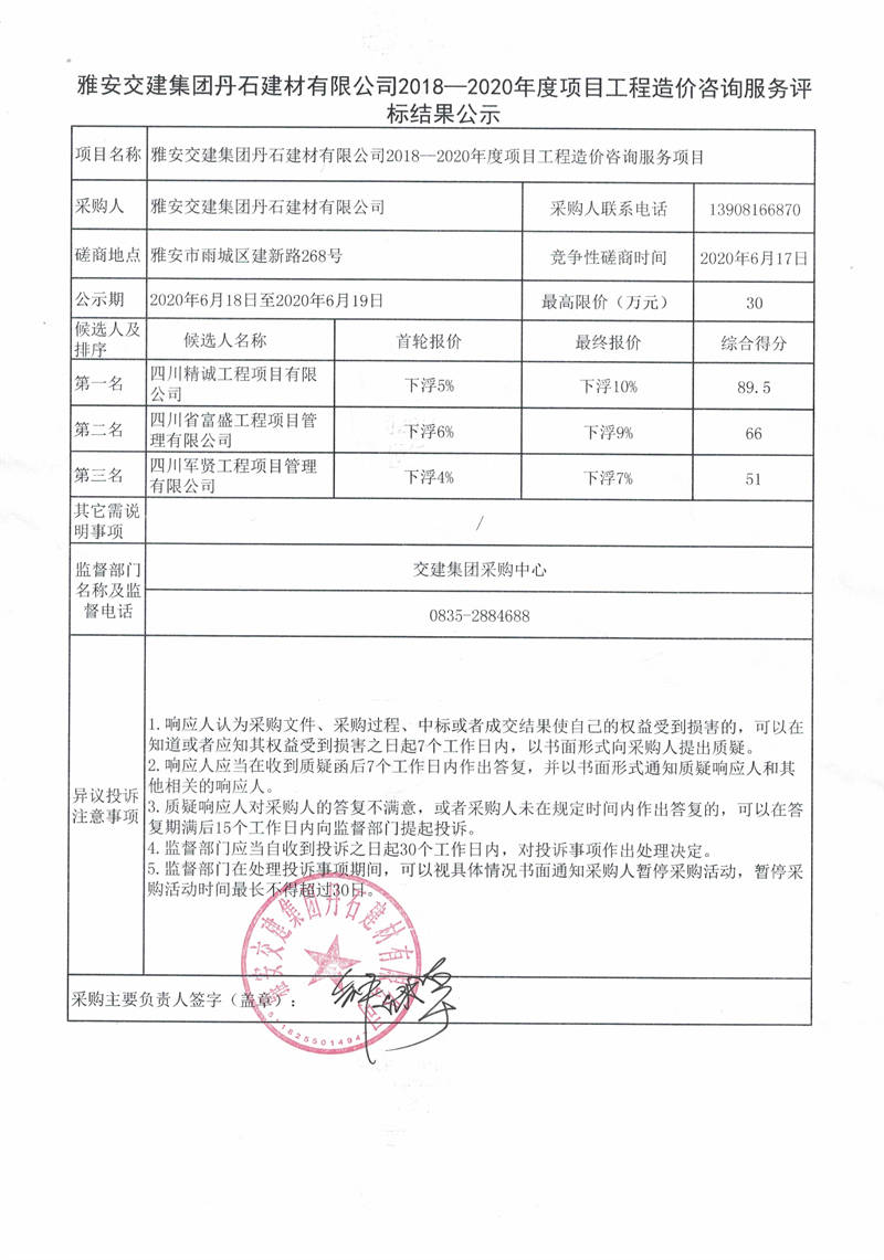 雅安交建集團丹石建材有限公司2018—2020年度項目工程造價咨詢服務(wù)評標(biāo)結(jié)果公示
