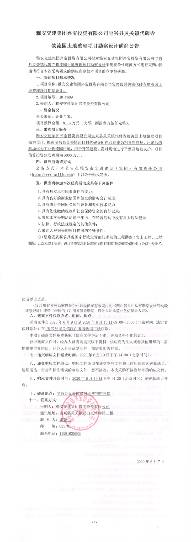 雅安交建集團(tuán)興寶投資有限公司寶興縣靈關(guān)鎮(zhèn)代碑寺物流園土地整理項目勘察設(shè)計競爭性磋商公告
