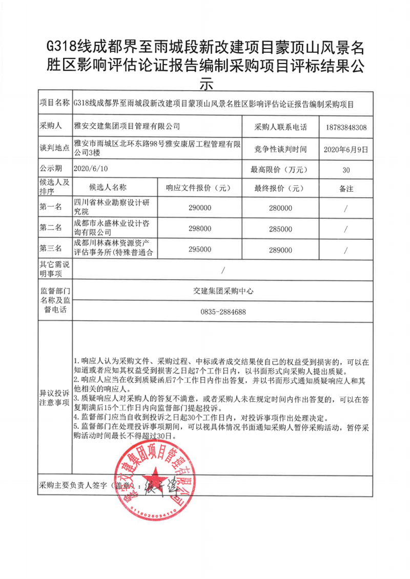 雅安交建集團項目管理有限公司G318線成都界至雨城段新改建項目蒙頂山風景名勝區(qū)影響評估論證報告編制采購項目評標結(jié)果公示