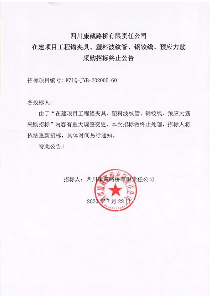 四川康藏路橋有限責(zé)任公司在建項(xiàng)目工程錨夾具、塑料波紋管、鋼鉸線、預(yù)應(yīng)力筋采購(gòu)招標(biāo)終止公告