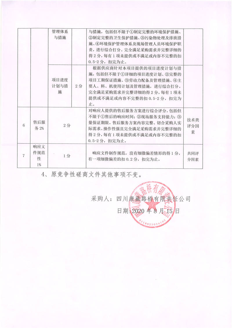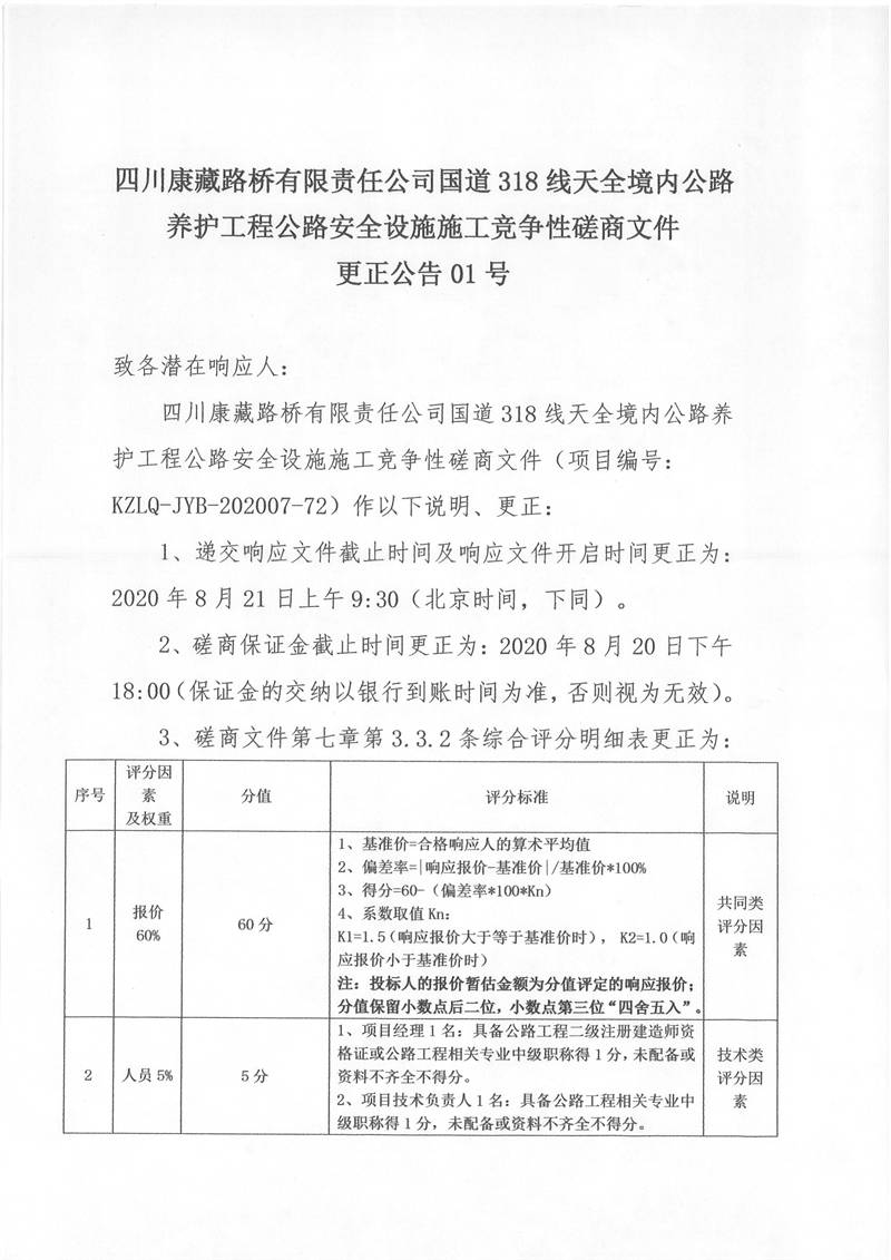四川康藏路橋有限責任公司國道318線天全境內(nèi)公路養(yǎng)護工程公路安全設(shè)施施工競爭性磋商文件更正公告01號