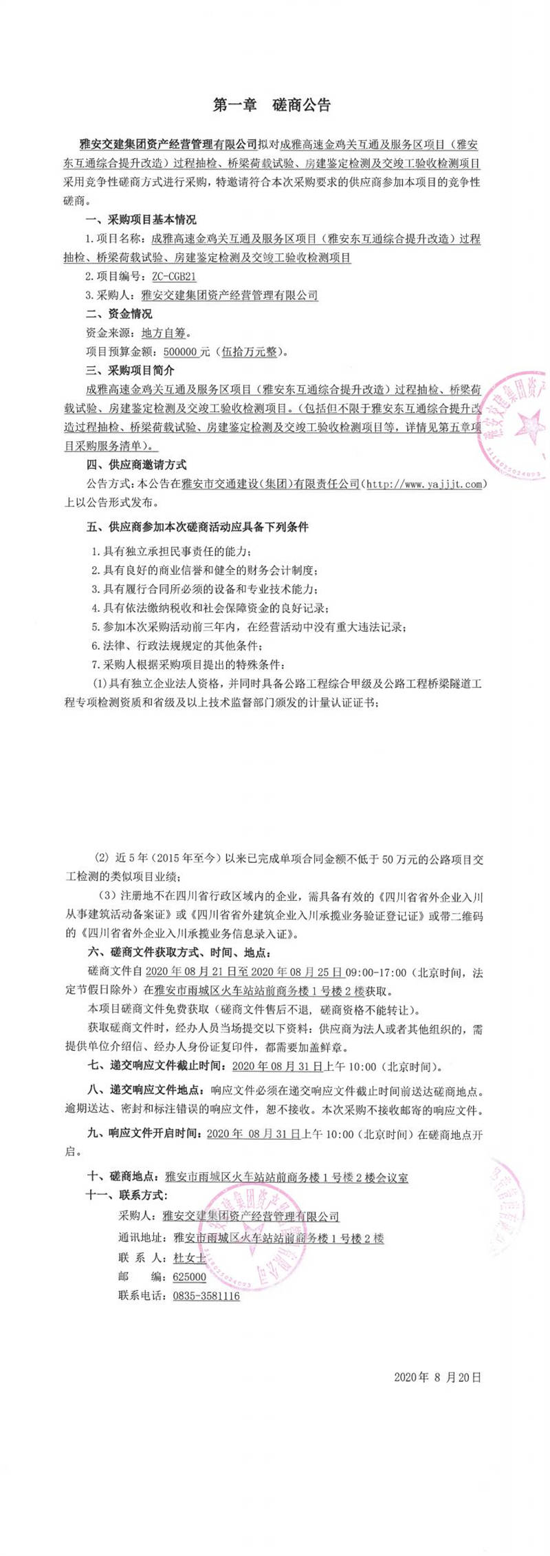 雅安交建集團資產(chǎn)經(jīng)營管理有限公司成雅高速金雞關(guān)互通及服務(wù)區(qū)項目(雅安東互通綜合提升改造)過程抽檢、橋梁荷載試驗、房建鑒定檢測及交竣工驗收檢測項目磋商公告