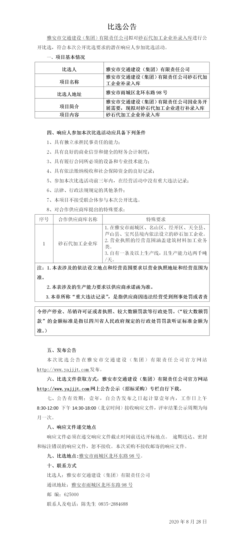 雅安市交通建設(shè)(集團(tuán))有限責(zé)任公司砂石代加工企業(yè)補(bǔ)錄入庫(kù)比選公告
