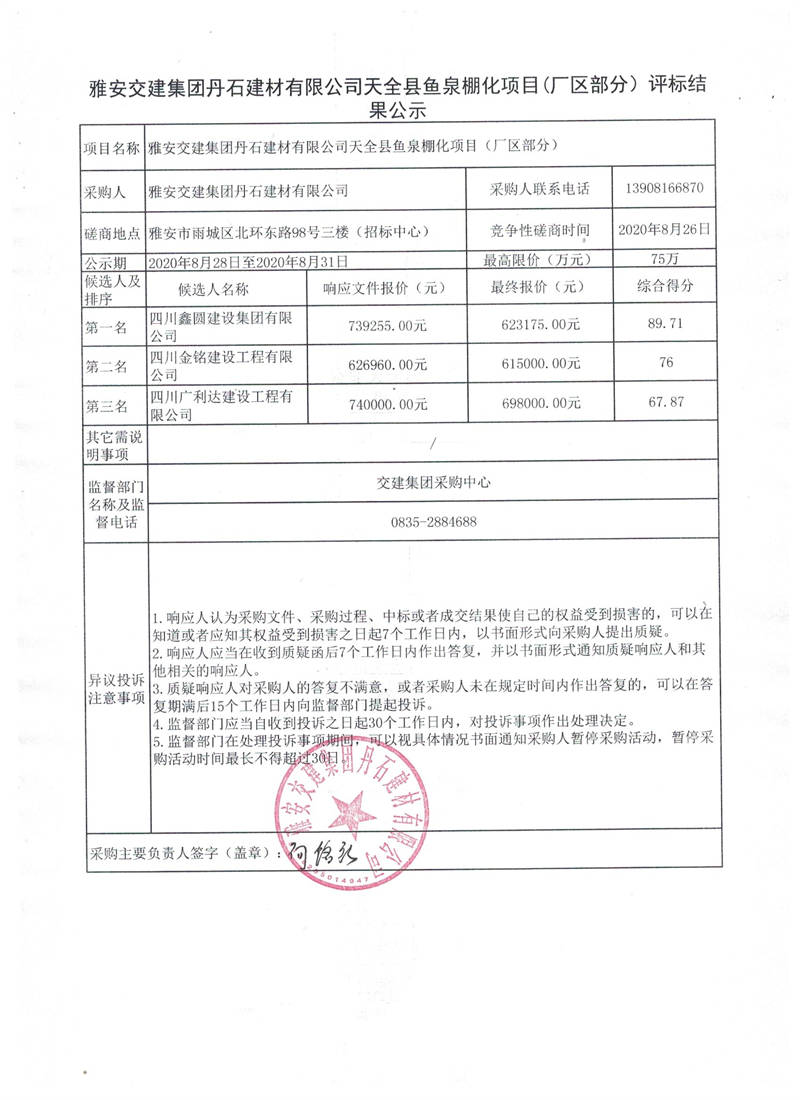 雅安交建集團(tuán)丹石建材有限公司天全縣魚泉棚化項(xiàng)目(廠區(qū)部分)評標(biāo)結(jié)果公示