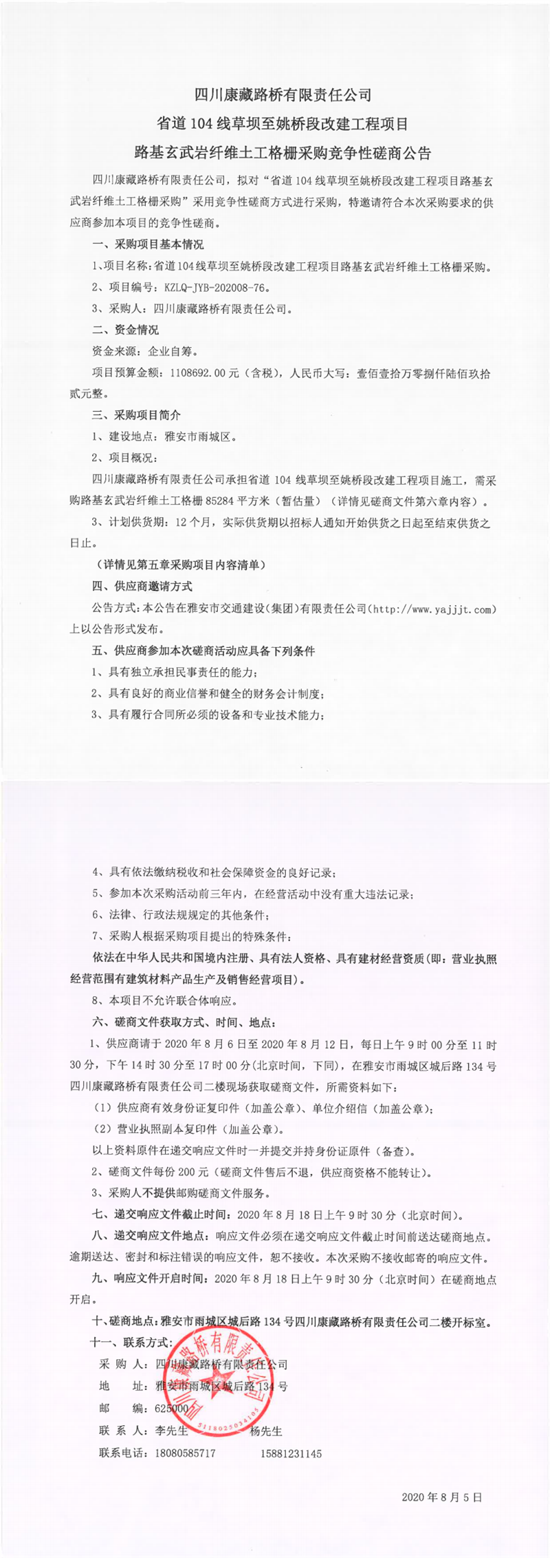 四川康藏路橋有限責(zé)任公司省道104線草壩至姚橋段改建工程項目路基玄武巖纖維土工格柵采購競爭性磋商公告