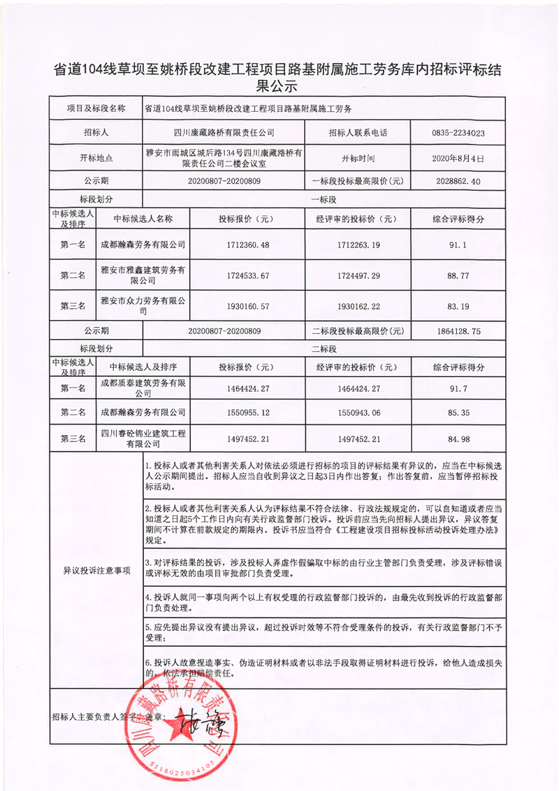 四川康藏路橋有限責任公司省道104線草壩至姚橋段改建工程項目路基附屬施工勞務庫內(nèi)招標評標結(jié)果公示