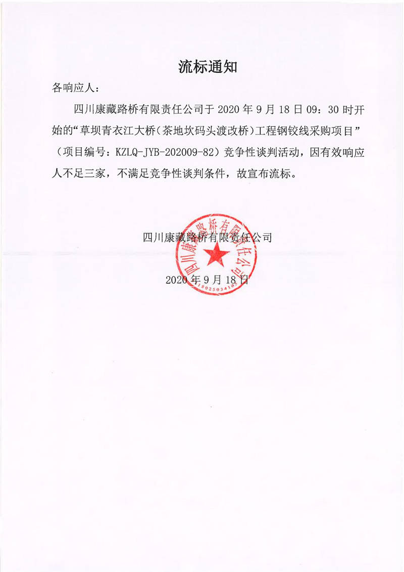 四川康藏路橋有限責(zé)任公司草壩青衣江大橋(茶地坎碼頭渡改橋)工程鋼鉸線采購項目流標(biāo)通知