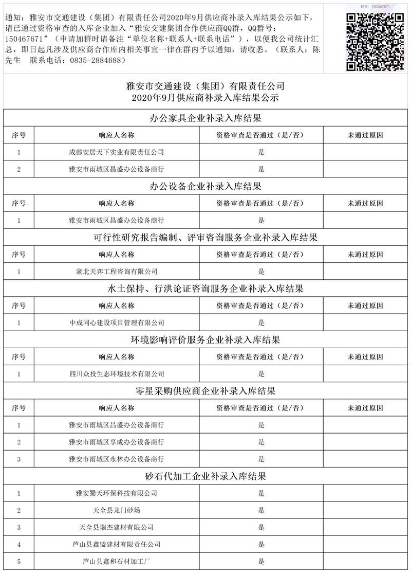 雅安市交通建設(shè)(集團(tuán))有限責(zé)任公司2020年9月供應(yīng)商補(bǔ)錄入庫(kù)結(jié)果公示