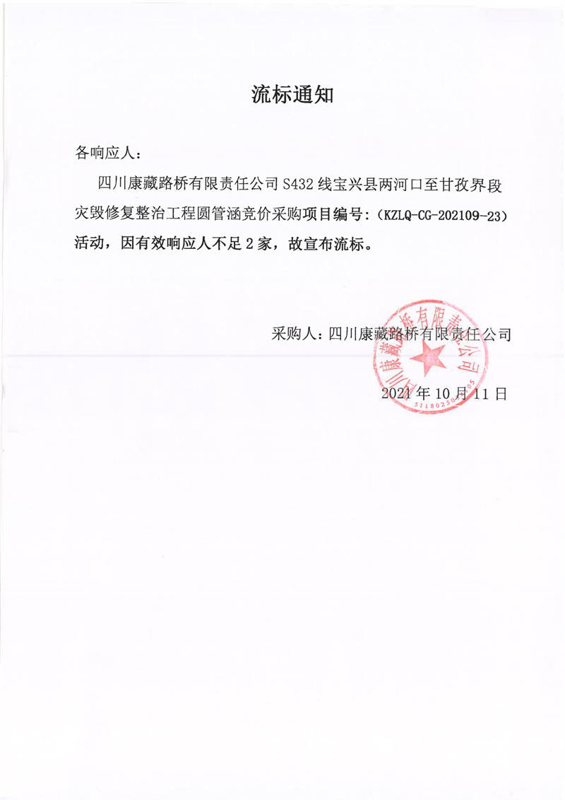 四川康藏路橋有限責(zé)任公司S432線寶興縣兩河口至甘孜界段災(zāi)毀修復(fù)整治工程圓管涵采購(gòu)競(jìng)價(jià)流標(biāo)通知