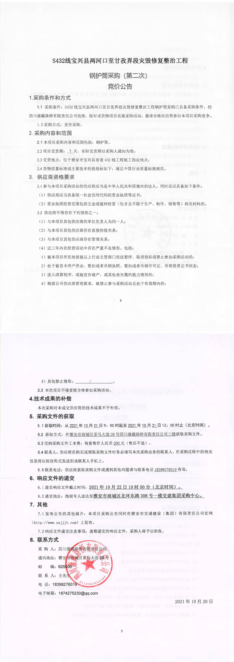 四川康藏路橋有限責(zé)任公司S432線寶興縣兩河口至甘孜界段災(zāi)毀修復(fù)整治工程鋼護(hù)筒采購(第二次)競(jìng)價(jià)公告
