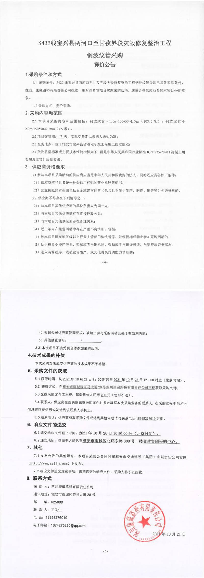 四川康藏路橋有限責(zé)任公司S432線(xiàn)寶興縣兩河口至甘孜界段災(zāi)毀修復(fù)整治工程鋼波紋管采購(gòu)競(jìng)價(jià)公告