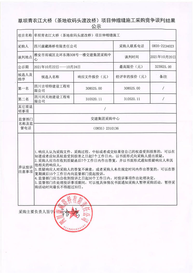 四川康藏路橋有限責(zé)任公司草壩青衣江大橋(茶地坎碼頭渡改橋)項(xiàng)目伸縮縫施工采購競(jìng)爭(zhēng)談判結(jié)果公示
