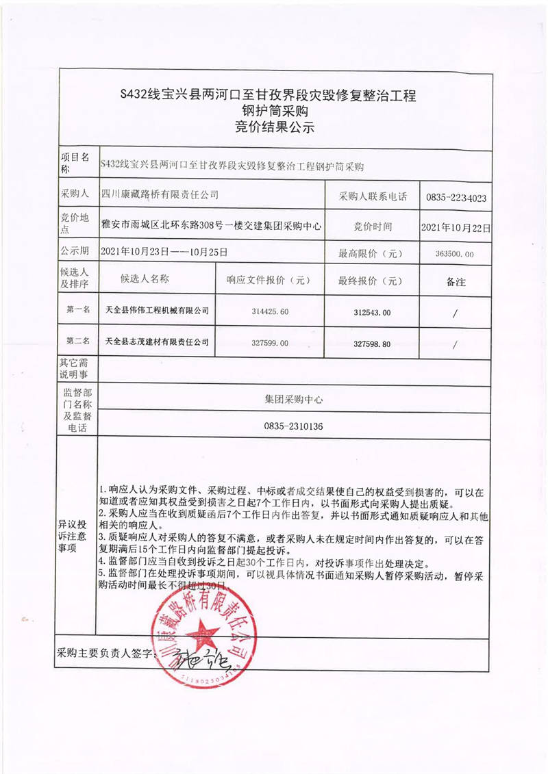 四川康藏路橋有限責(zé)任公司S432線寶興縣兩河口至甘孜界段災(zāi)毀修復(fù)整治工程鋼護(hù)筒采購競價結(jié)果公示