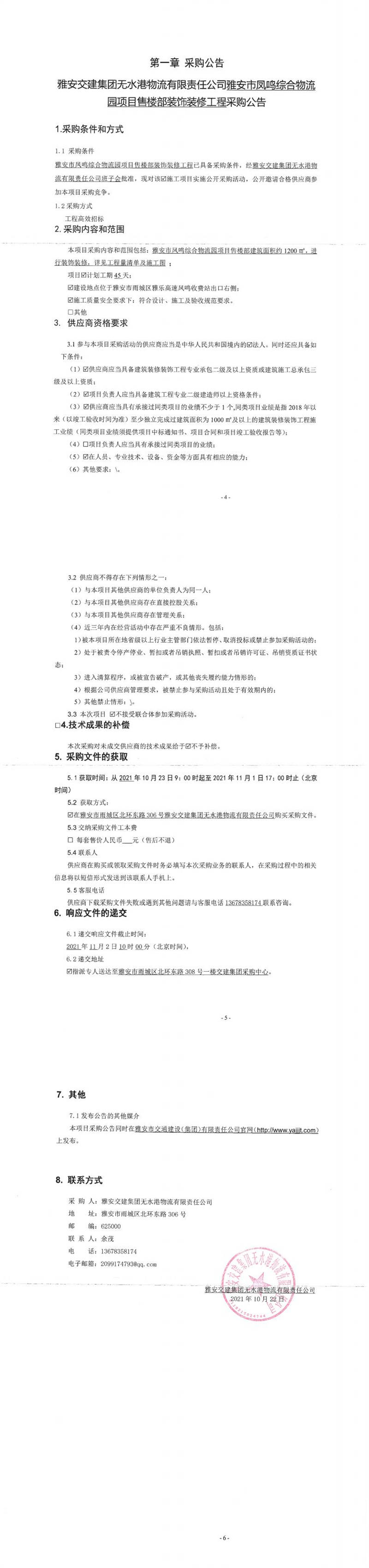 雅安交建集團(tuán)無(wú)水港物流有限責(zé)任公司雅安市鳳鳴綜合物流園項(xiàng)目售樓部裝飾裝修工程采購(gòu)公告