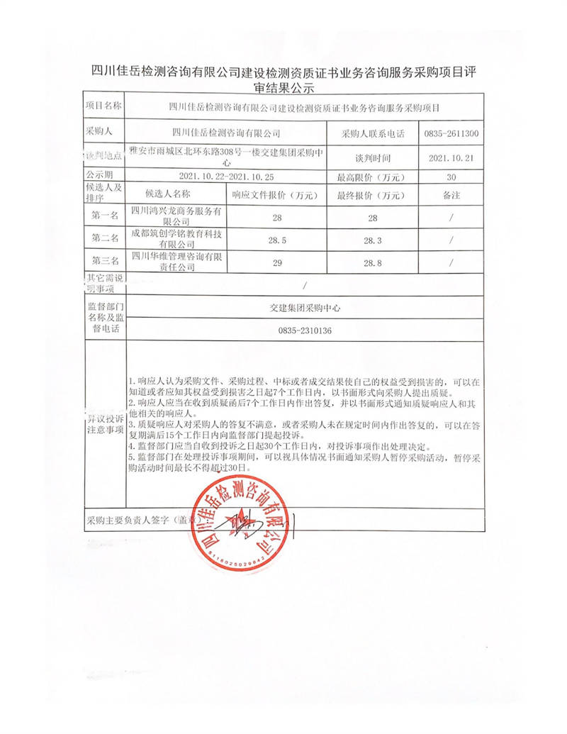 四川佳岳檢測咨詢有限公司建設(shè)檢測資質(zhì)證書業(yè)務(wù)咨詢服務(wù)采購項(xiàng)目評審結(jié)果公示