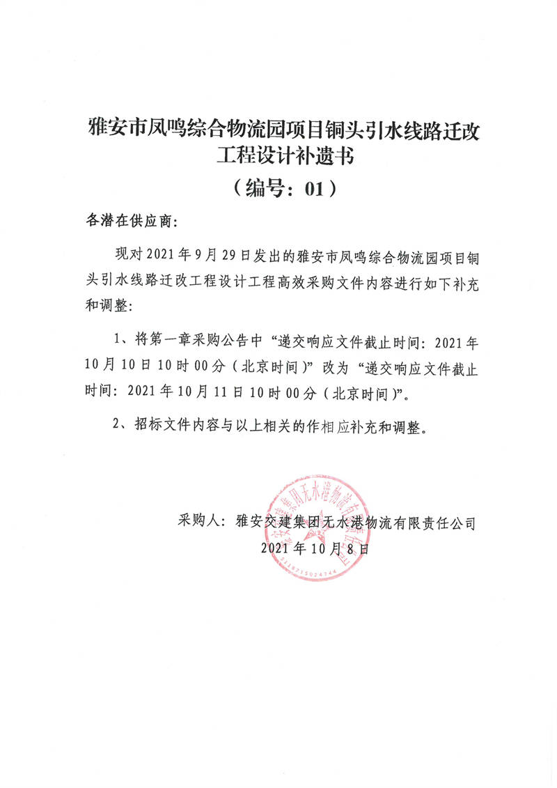 雅安交建集團(tuán)無(wú)水港物流有限責(zé)任公司雅安市鳳鳴綜合物流園項(xiàng)目銅頭引水線路遷改工程設(shè)計(jì)補(bǔ)遺書(shū)