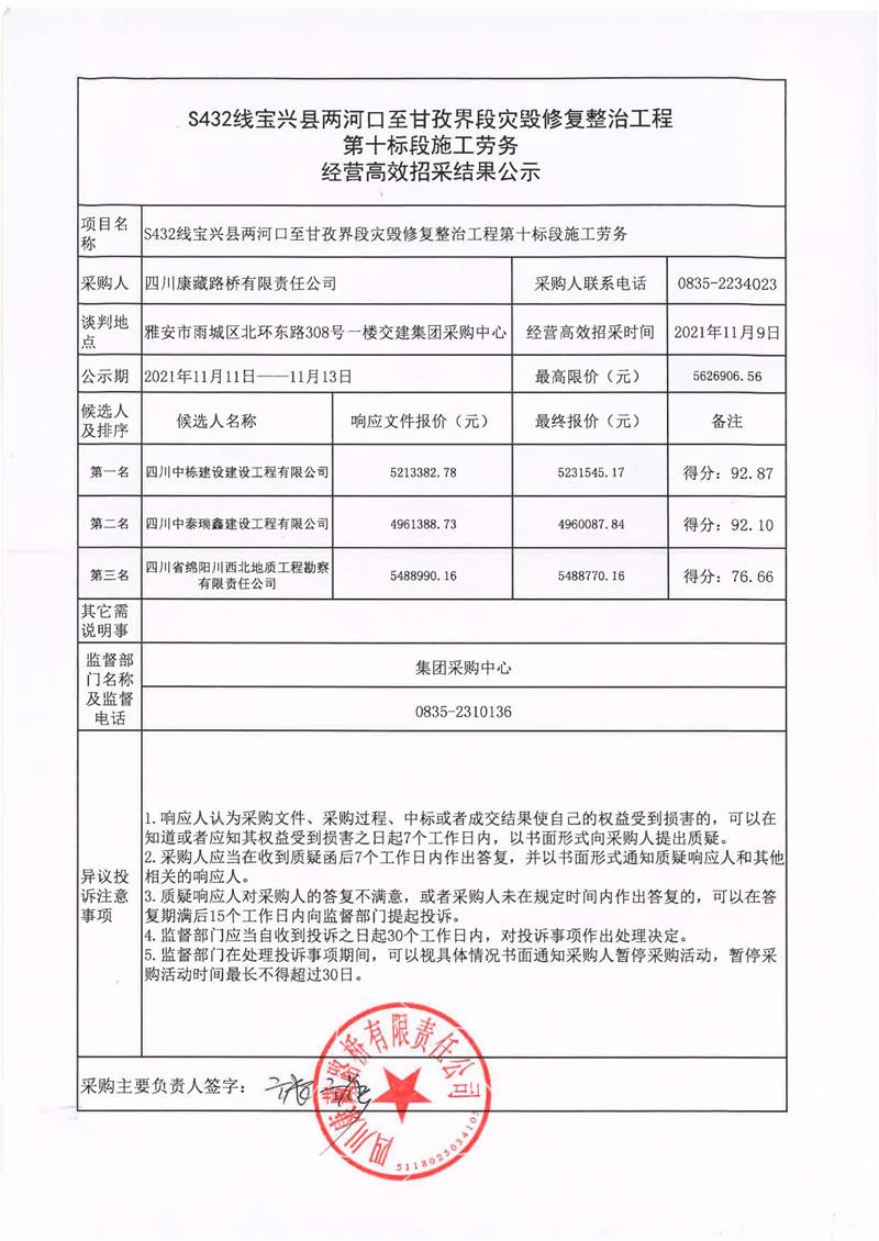 四川康藏路橋有限責任公司S432線寶興縣兩河口至甘孜界段災(zāi)毀修復(fù)整治工程第十標段施工勞務(wù)經(jīng)營高效招采結(jié)果公示