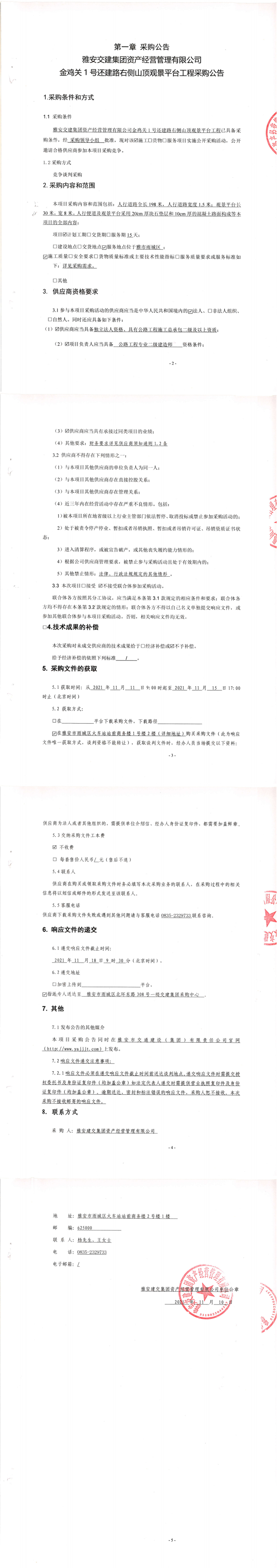 雅安交建集團(tuán)資產(chǎn)經(jīng)營(yíng)管理有限公司金雞關(guān)1號(hào)還建路右側(cè)山頂觀景平臺(tái)工程采購(gòu)公告