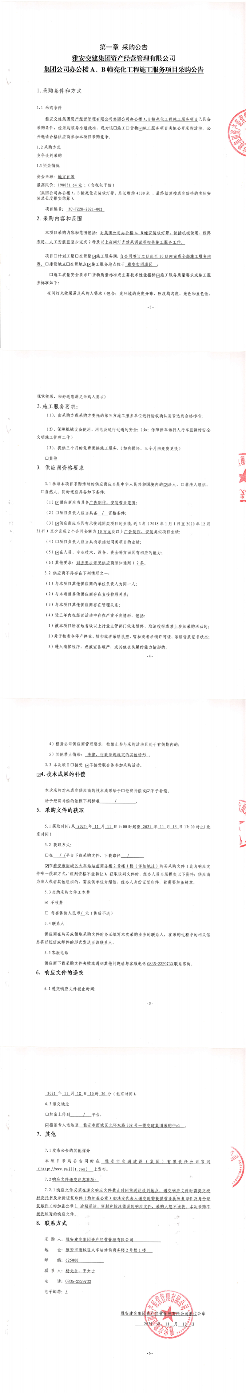 雅安交建集團(tuán)資產(chǎn)經(jīng)營(yíng)管理有限公司集團(tuán)公司辦公樓A、B幢亮化工程施工服務(wù)項(xiàng)目采購(gòu)公告