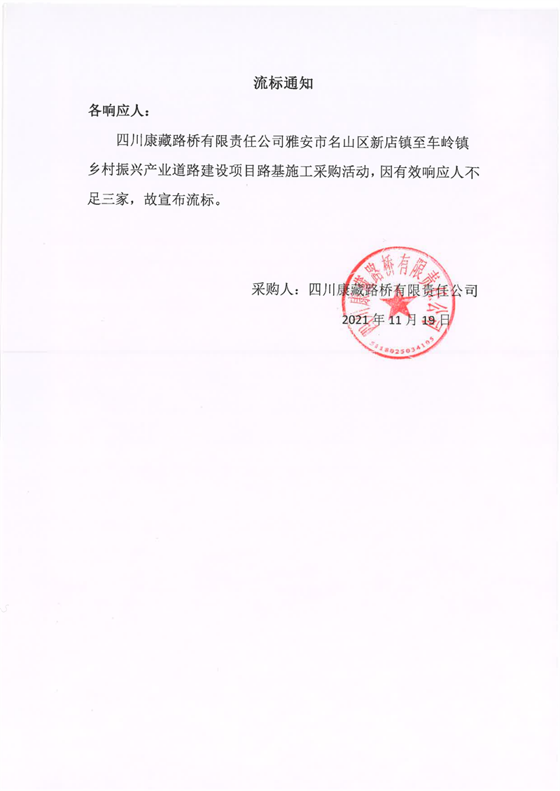 四川康藏路橋有限責(zé)任公司雅安市名山區(qū)新店鎮(zhèn)至車嶺鎮(zhèn)鄉(xiāng)村振興產(chǎn)業(yè)道路建設(shè)項目路面施工采購流標(biāo)通知