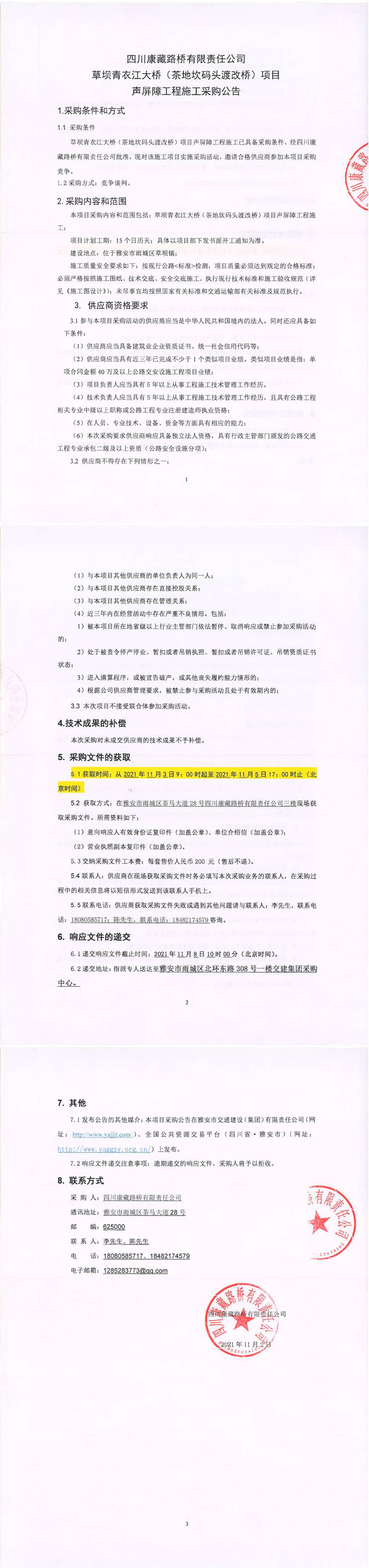 四川康藏路橋有限責(zé)任公司草壩青衣江大橋(茶地坎碼頭渡改橋)項目聲屏障工程施工競爭談判采購公告